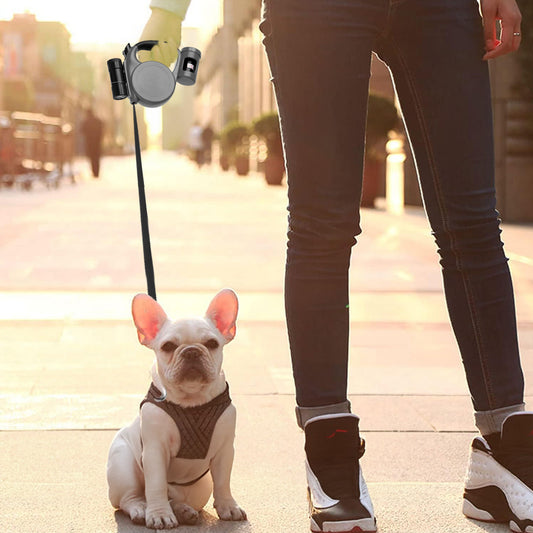 Dog Lead with Anti-Slip Handle, 3-in-1 Pet Leash with Waste Bag Dispenser, 5M, 16FT Strong Nylon Tape, Up To 20 KG, One-Handed Brake, Pause, Lock, Ideal for Walking Running Training, Black/Blue/Grey