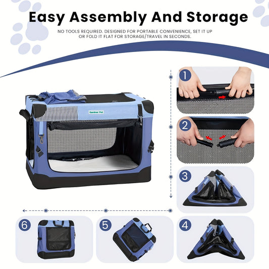 Collapsible Dog Crate] Soft Collapsible Dog Travel Crate | 3-Door Anti-bite Mesh & Storage Bag | Portable Car Crate For Puppy/Small Dogs, 3-Size, Denie Blue